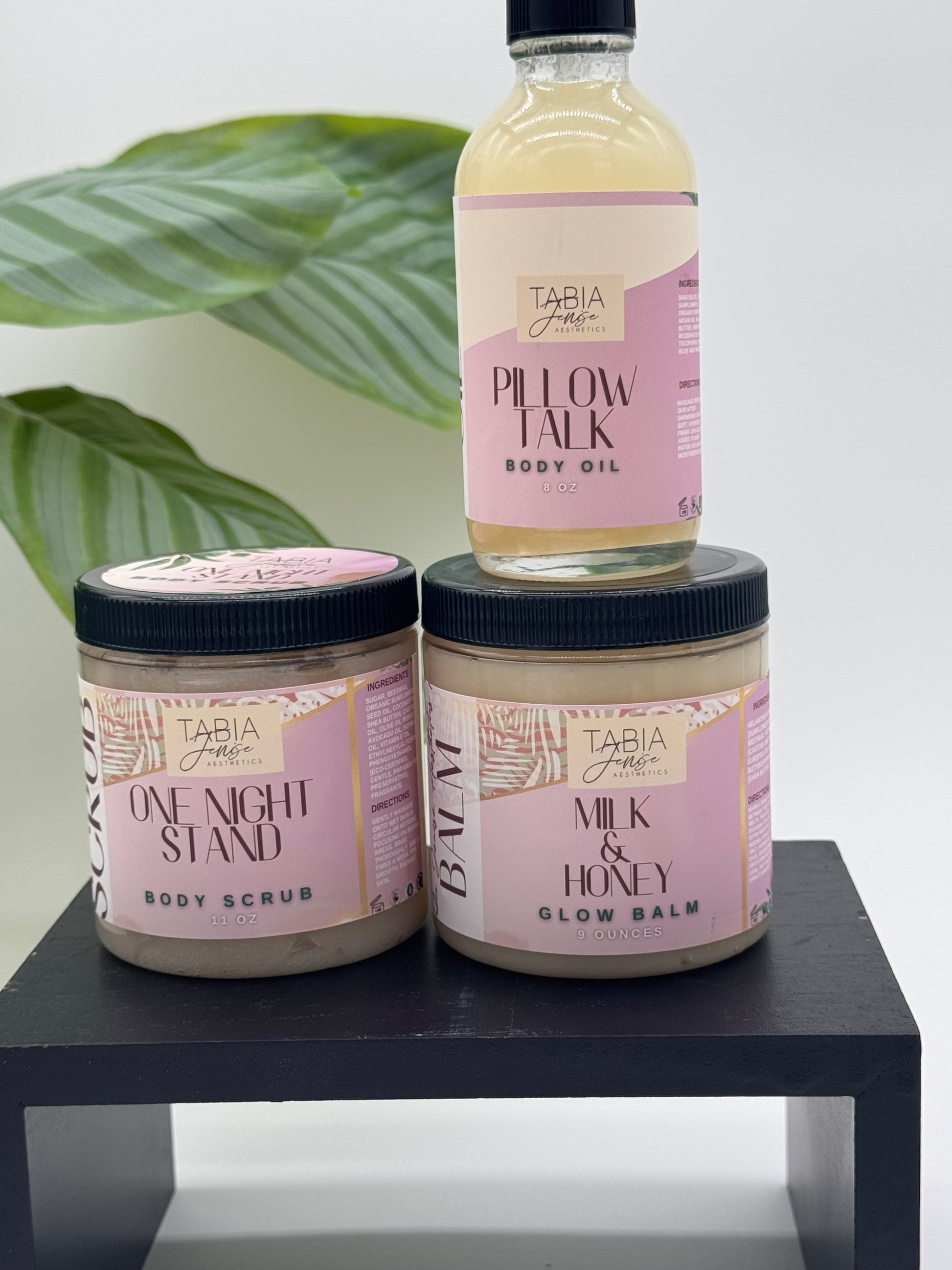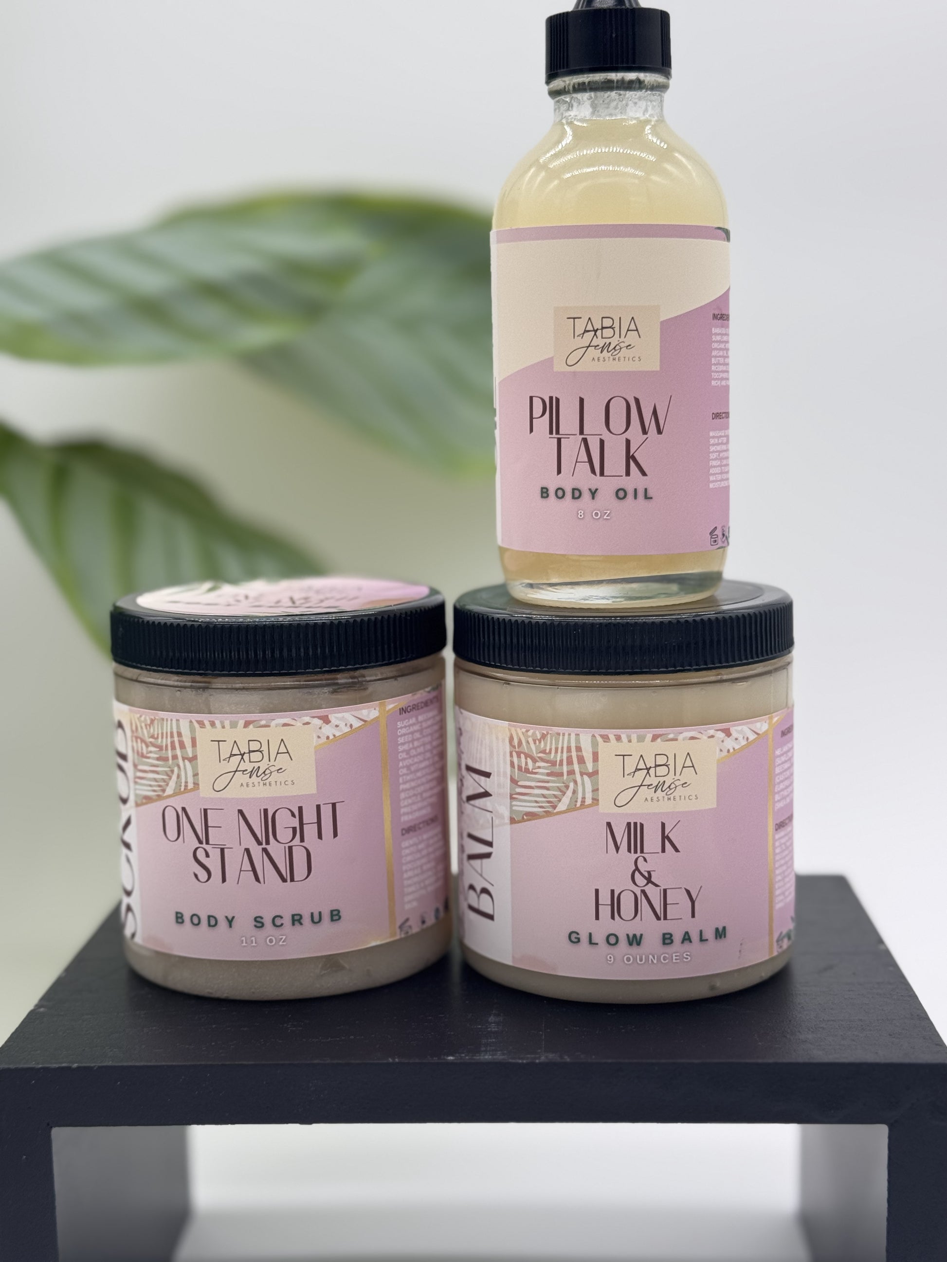 Exfoliate, moisturize, and glow with our Hydration Trio. Start with our exfoliating Body Scrub to buff away dry skin, deeply nourish with our Signature Body Balm and finish with our Body Oil to lock in hydration and give your skin a smooth, radiant glow.